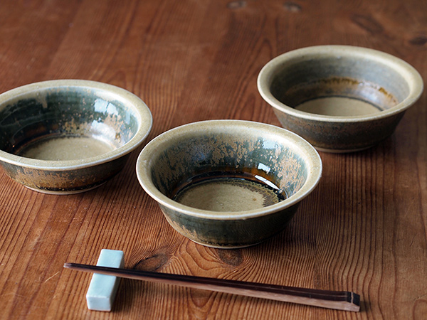 灰釉のモスグリーンに立ち上がりの部分は呉須と飴釉も複雑に混ざってカッコイイ中鉢。